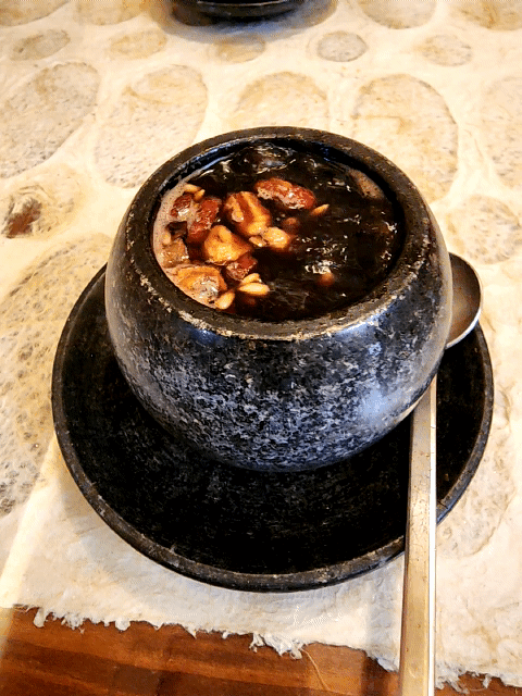 저희는 쌍화차와 마즙을 주문했습니다. 잠시후에 보글보글 끓고 있는 쌍화차와 시원하게 갈아진 마즙이 나왔습니다. 쌍화차는 돌로 만든 잔에 담겨 나왔는데 무게가 좀 있고 굉장히 뜨거워서 함께 나온 수저로 천천히 떠먹어야 합니다. 수제 쌍화탕이라서 그런지 안에 잣, 대추, 호두, 해바라기씨, 밤등 온갖 종류의 견과류가 가득 차있었습니다. 한입 떠먹으니 너무 달지도 너무 쓰지도 않은 몸이 건강해지는 맛이었습니다. 마즙은 우유처럼 고소하고 부드러웠습니다. 제가 평소에 마를 좋아하는 편이 아닌데도 거부감이 없이 마실 수 있을 정도로 좋았습니다.