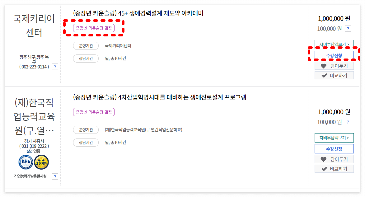 중장년 새출발 카운들링 대상자가 새로운 직무를 위한 다양한 수업을 들을 수 있도록 수업비용을 지원합니다. 국민내일배움카드는 변화하는 시대에 발맞춘 새로운 직종과 분야에 대한 구체적이로 심도있는 수업들이 다양하게 마련되어 있습니다.